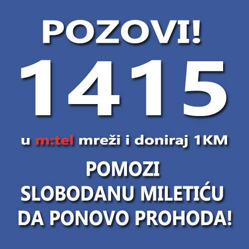 Tokom juna biće aktivan m:tel humanitarni broj 1415, namenjen za prikupljanje novca za lečenje Slobodana Miletica (28) iz Teslića. On je u avgustu prošle godine povredio kičmenu moždinu u teškoj saobraćajnoj nesreći kod Prijedorske petlje u Banjoj Luci i trenutno je nepokretan, a jedina nada za oporavak je transplantacija matičnih ćelija.