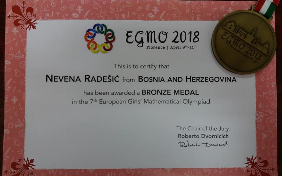 TESLIĆ - Nevena Radešić, učenica trećeg razreda Gimnazije teslićke Srednje škole "Јovan Dučić" osvojila je bronzanu medalju na Evropskoj olimpijadi iz matematike za djevojke. Na takmičenju u Firenci učestvovalo je 200 najboljih evropskih matematičarki.